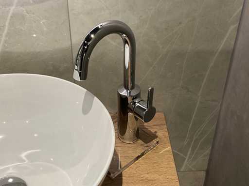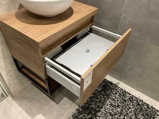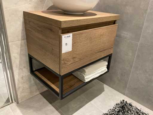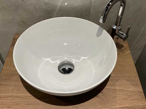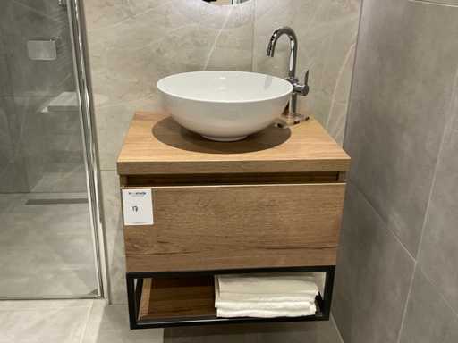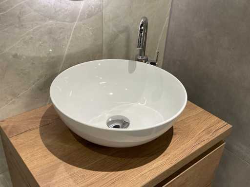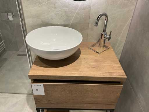 v.v. onderkast met bovenblad; kleur Tobacco; waskom; afm. ca. 40x15 cm; “Damixa” enkelgreeps mengkraan;; spiegel met verlichting; afmeting circa 40x100 cm