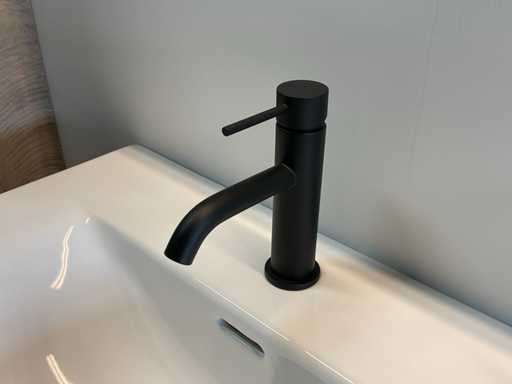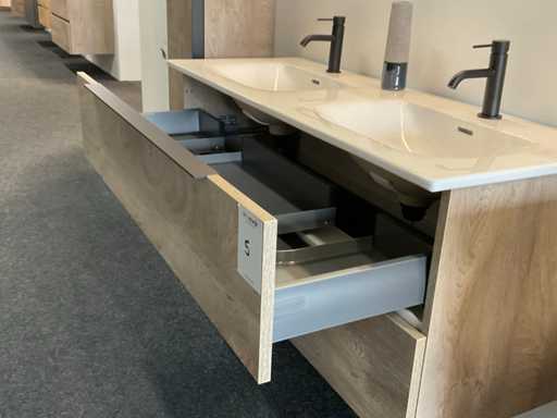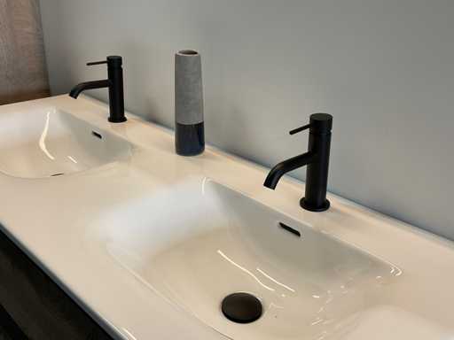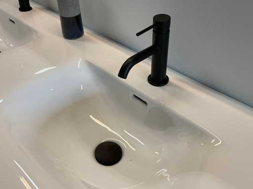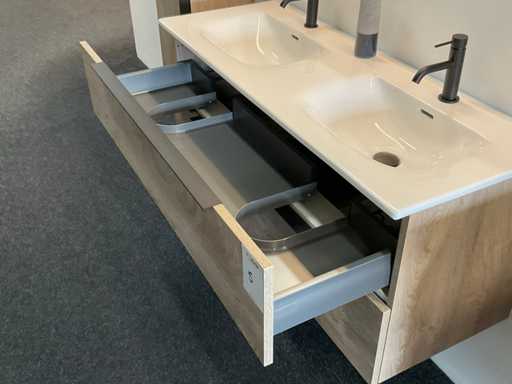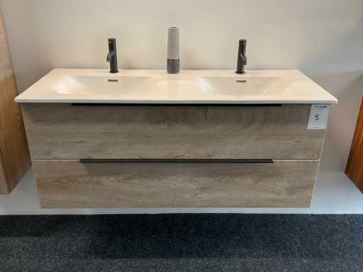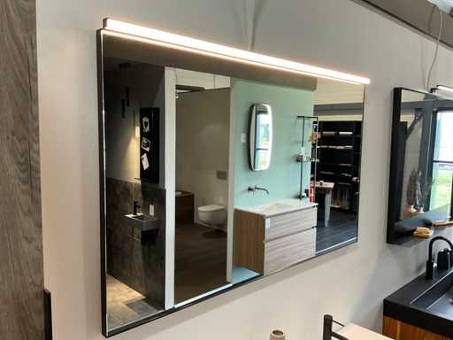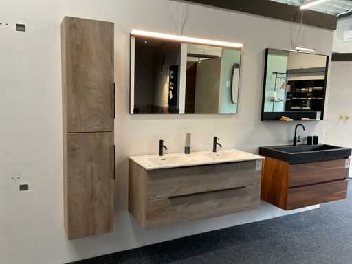 v.v. keramische wastafel met 2 wasbakken; 2x enkelgreeps mengkraan; badkamerkast met 2 deuren; afmeting circa 35x29x165 cm; spiegel met verlichting; afmeting circa 120x70 cm