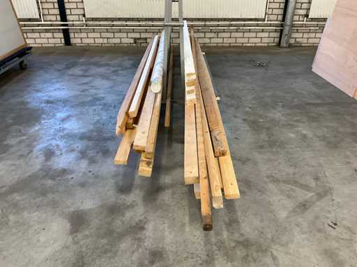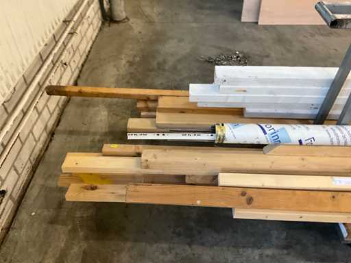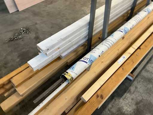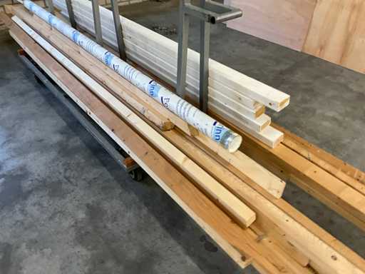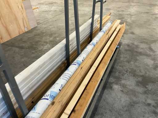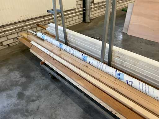 diverse balken, onder andere balken 70x45 mm, 70x30 mm, diverse lengtes tot lengte 4460 mm, inclusief platen transportwagen,