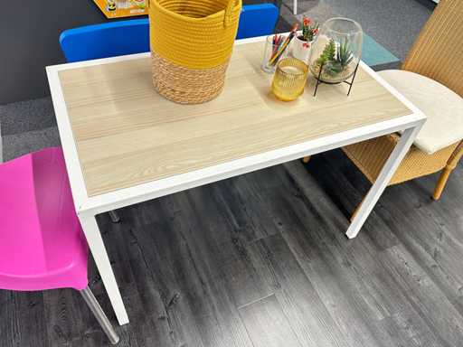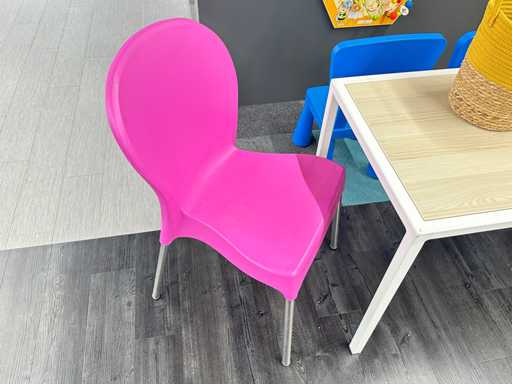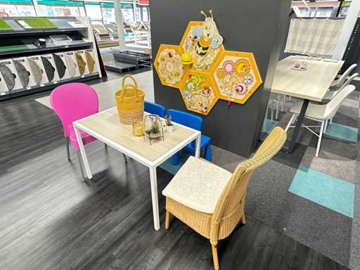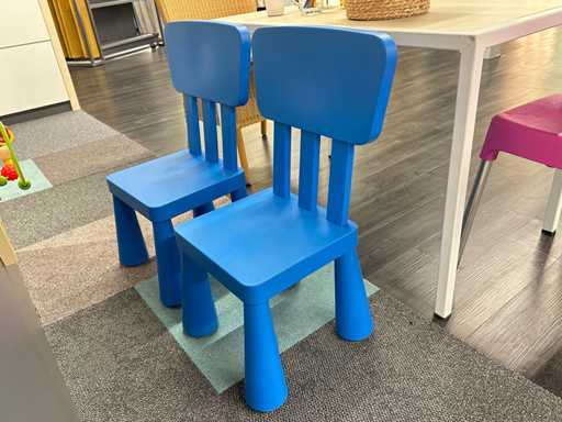 Inclusief twee blauwe kunststof kinderstoeltjes, tafel en twee stoelen.