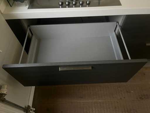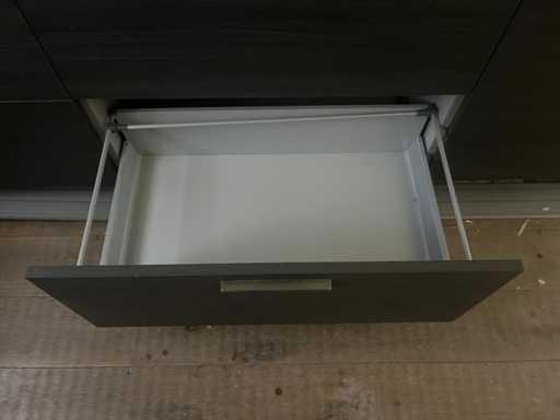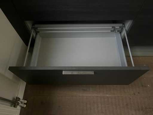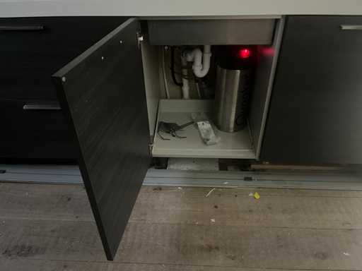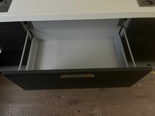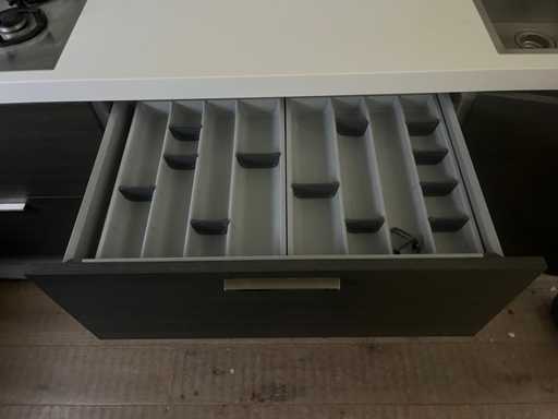 Conditie gebruikt; afmetingen rechte deel lxb ca. 313x60 cm; afmetingen kastblok lxb ca. 180x60 cm; reeds gedemonteerd en ingepakt op pallets (afstapelen, omruilen of statiegeld per pallet); pallets zijn niet inbegrepen; statiegeld betalen bij afhalen, of pallets afstapelen; werkblad niet ingepakt op pallets