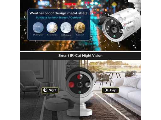 Draadloos camera bewakingset set met 8 nachtzicht cameras; dankzij de netwerkaansluiting volgt u uw cameras via internet en met uw smartphone; dag en nacht; een zonnekap beschermt tegen fel zonlicht; overdag leveren de cameras een scherp beeld in kleur; zodra het donker wordt schakelen de infrarood leds aan (nachtzicht afstand tot wel 25 meter) in doos