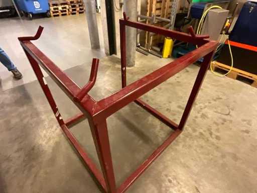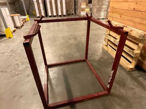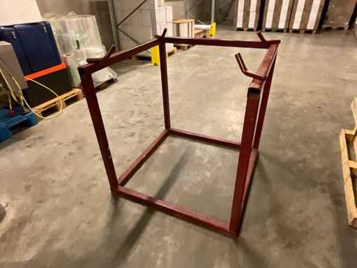 Gelaste stalen constructie, kubusvormig, uitgerust met 4 schuine steunen in het bovenste deel die het opbergen van een container mogelijk maken (type container, tank of grote zak).