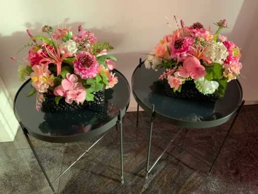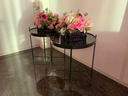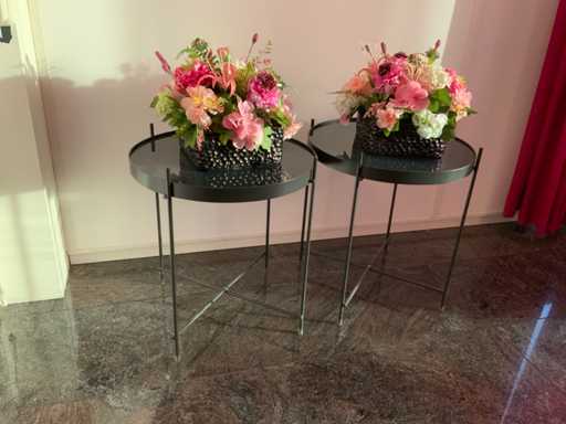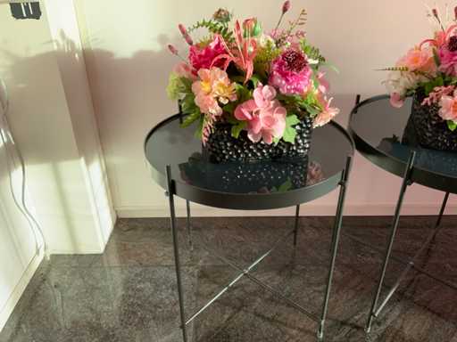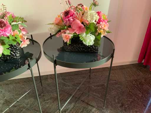 Voorzien van vierpotig onderstel en glazen tafelblad.