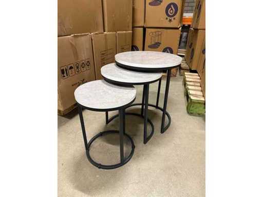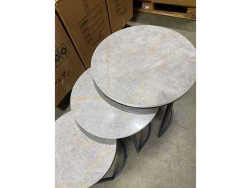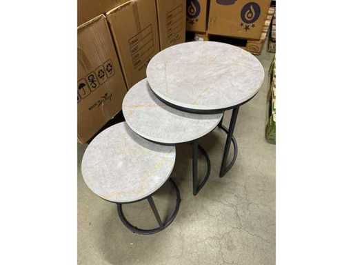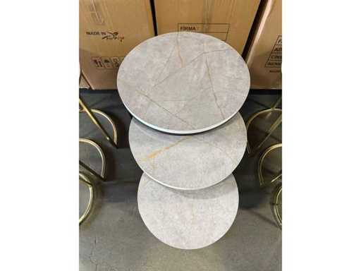 Deze driedelige bijzettafel set combineert een verfijnd design met praktische veelzijdigheid. De tafels zijn ontworpen om perfect samen te gebruiken als speelse compositie, maar kunnen ook afzonderlijk worden geplaatst als stijlvolle bijzettafel, salontafel of decoratief element. Het elegante onderstel zorgt voor een luxe en luchtige uitstraling, terwijl het ronde blad een tijdloos karakter toevoegt. Dankzij de verschillende hoogtes en diameters schuiven de tafels moeiteloos onder elkaar, wat ruimtebesparend én visueel aantrekkelijk is. Ideaal voor de woonkamer, slaapkamer, hal of kantoor. De set past perfect in zowel moderne, minimalistische als klassieke interieurs en vormt een subtiele blikvanger in elke ruimte. Afmetingen Grote tafel Hoogte: 52 cm Diameter: 47 cm Middelgrote tafel Hoogte: 47 cm Diameter: 39 cm Kleine tafel Hoogte: 42 cm Diameter: 31 cm