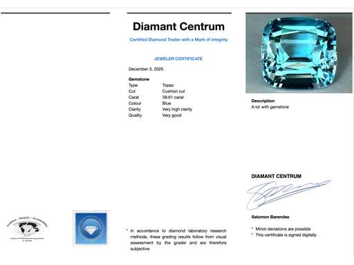 Edelsteen: Topaas; Aantal: 1 stuk; Slijpvorm: Kussen geslepen; Gewicht (carat): 38.61 carat; Kleur: Blauw; Zuiverheid: Zeer hoge zuiverheidsgraad; Slijpkwaliteit: Heel mooi; Conditie: Nieuw; Verpakking: Edelsteendoos; Toelichting: De kwaliteit is overgenomen van het rapport behorend bij item.