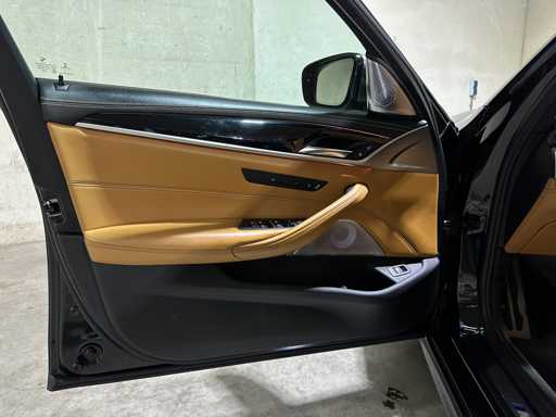 BMW M550i xDrive High Executive Individual uit 2017, uitgevoerd in Black Sapphire metallic met een BMW Individual vollederen interieur in Caramel.