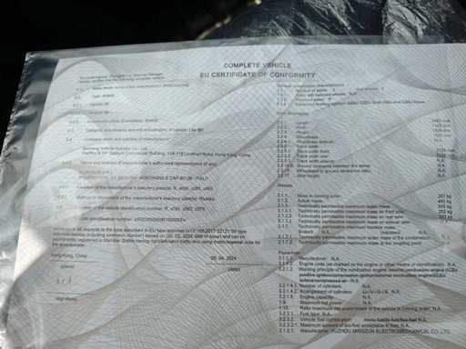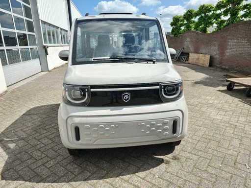 voorzien van: documentatie (COC voor kenteken inschrijving), 4.00-10 banden afmetingen: 2483x1320x1626mm, max snelheid 45 km/h, 3.00Kw motor, automaat versnellingsbak, actieradius: max 70 kilometer, digitaal display, 2-persoons cabine, verlichting, ongebruikt