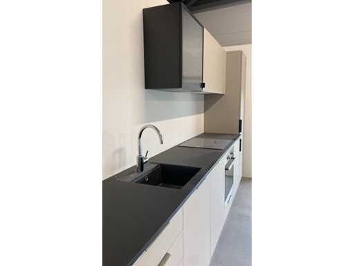 De keuken bestaat uit een ruimte voor een koelkast, een oven, een 60-fornuis en een ladekap. Ondergemonteerde gootsteen inbegrepen in de prijs.