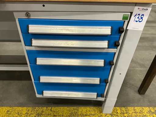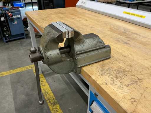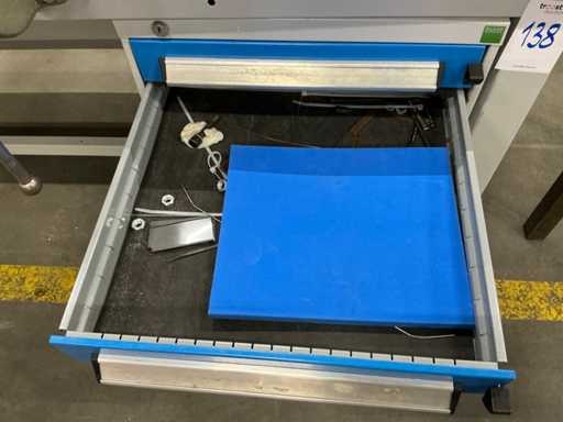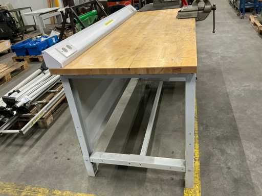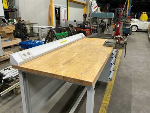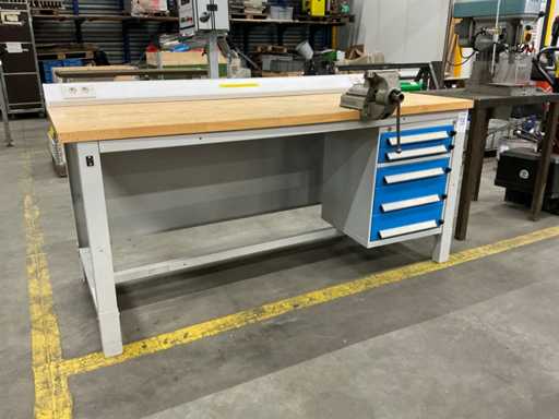 Stalen onderstel voorzien van ladenkast; houtenblad; opbouw met 4x stopcontact 230 Volt; met bankschroef