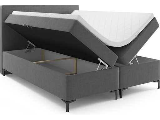 type: Basic tweepersoonsbed; afmeting B: 160 cm; afmeting L: 200 cm; stof; boxspring bestaande uit: 1 x hoofdbord, 2x box, 2x luxueus gestoffeerd matras, topper; kleur: grijs stof; staat: in verpakking;
