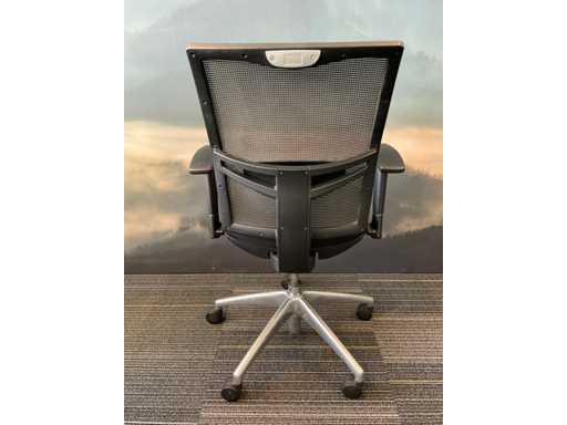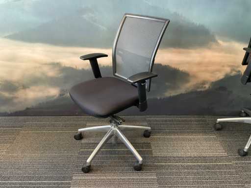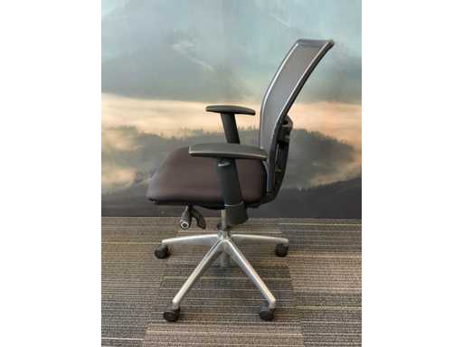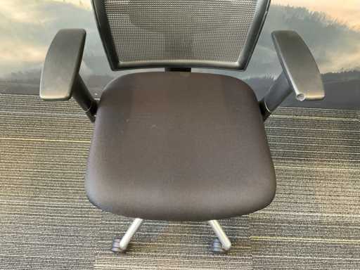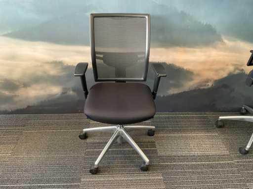 Voorzien van in hoogte verstelbare armleuningen, netweave rugleuning met lendesteun, zwart gestoffeerde zitting en stalen onderstel