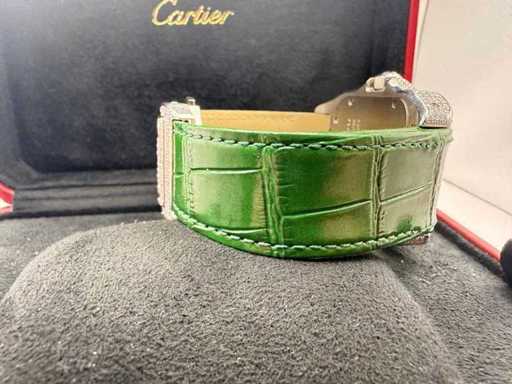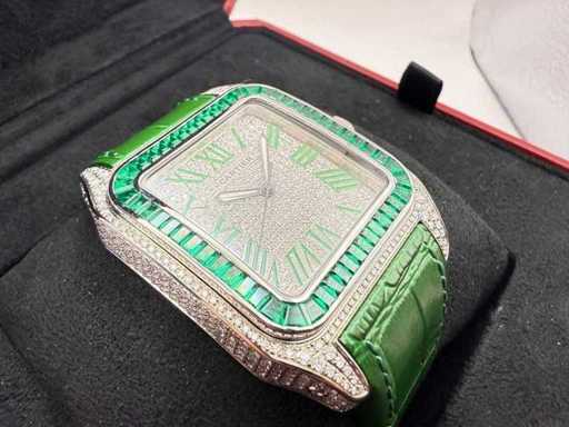 Model: Cartier Santos 100 Medium Case & Dial: Fully iced out with real genuine natural VS diamonds Bezel: Moissanite baguette stones Strap: High-quality leather strap Condition: Custom luxury piece Style: Exclusive, bold, and elegant Please note: this is a customised watch, meaning it may include components that differ from the original factory specifications. Customisation can vary widely, so we highlight the following possibilities for full transparency: Aftermarket parts The watch may include third-party components (such as bezels, dials, hands, crystals or gem settings) that are not produced by the brand owner. These parts are often added for aesthetic reasons, but are not considered original by the manufacturer. Original parts from other models Some components (e.g. dials or bracelets) may have been sourced from other genuine watches by the same brand. While these parts are authentic, they were not originally fitted to this particular model or reference, which may affect collectability or eligibility for manufacturer service. Non-original parts In some cases, customised watches may include parts that are neither original nor manufactured by the brand. These components can affect the watch’s value. We encourage all bidders to carefully review the photos and description before placing a bid. Keep in mind: customised watches may not be eligible for official service or warranty from the brand. All bids should be placed with full awareness of the customisation status described above.