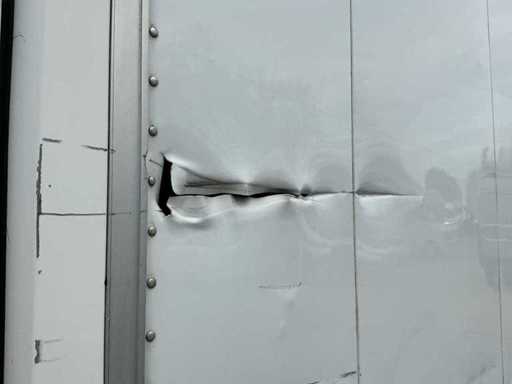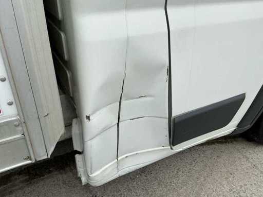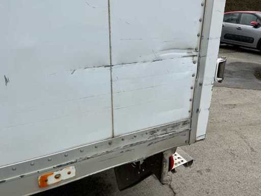 Carrosserie en opbouw vertonen duidelijke gebruikssporen, waaronder deuken en beschadigingen aan de laadbak en cabine.