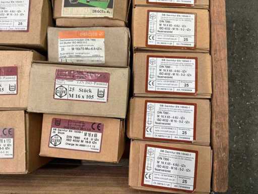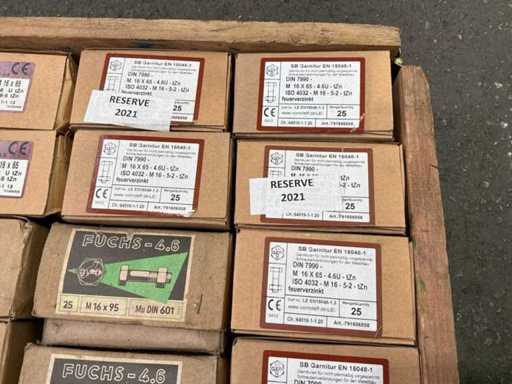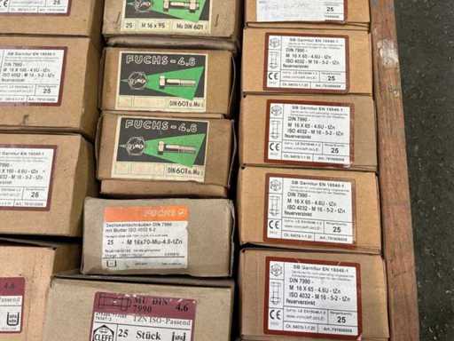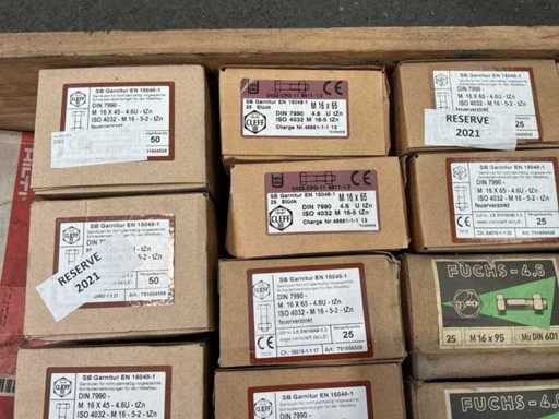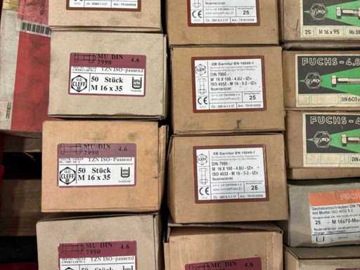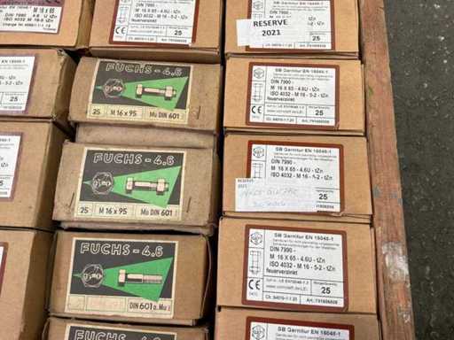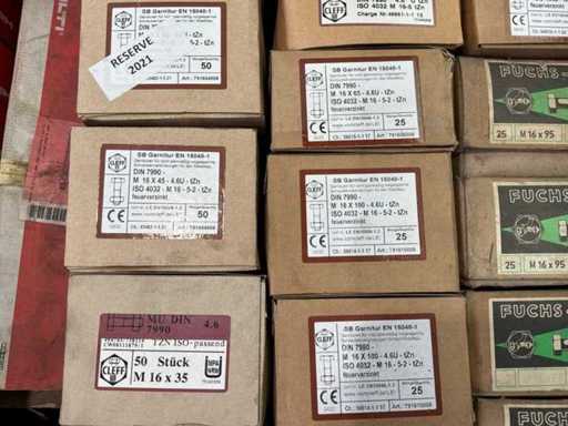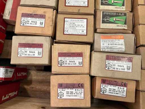 6x Doosjes met M16 bouten met moer van 50 stuks 27x Doosjes met M16 bouten met moer van 25 stuks