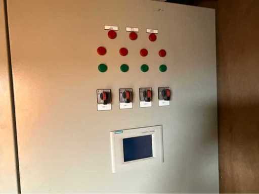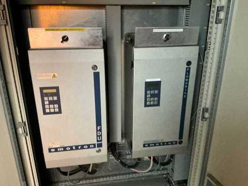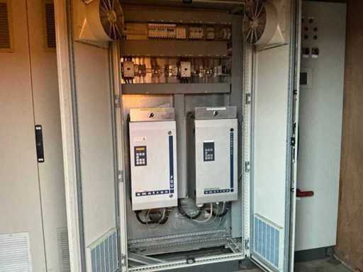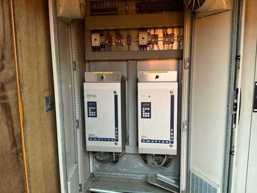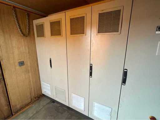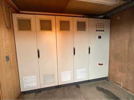 10ft-container uitgerust met een PLC-besturingssysteem voor het beheren van vier motoren van elk 45 kW, met Siemens Simatic besturingspaneel, stroomaansluiting 230 Volt; verlichting; twistlocks; heftruck vorksleuven;