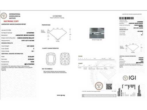 Deze labgegroeide diamant wordt geleverd met een officieel IGI-certificaat en -rapport dat de kwaliteit bevestigt. Bekijk het certificaat bij de foto’s of raadpleeg de tabel hierboven voor de gedetailleerde specificaties. Alle kenmerken zijn rechtstreeks overgenomen uit het bijhorende IGI-rapport.