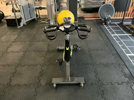 De spinningfiets bevindt zich in gebruikte maar werkende staat.