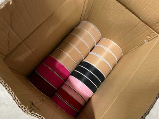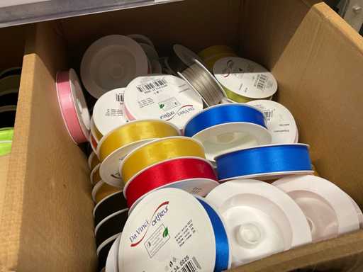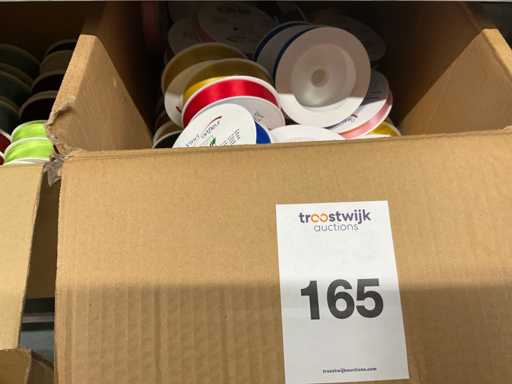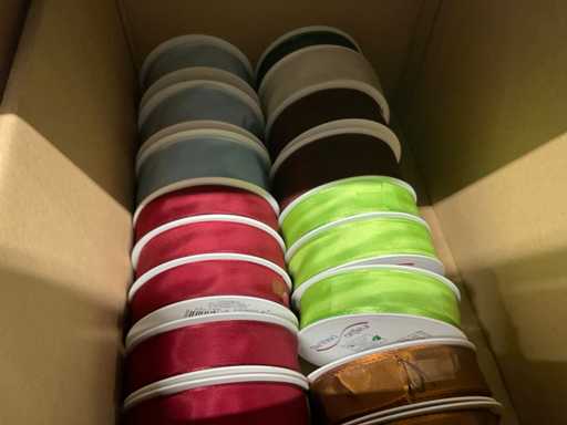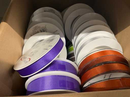 Linten in diverse kleuren, breedtes en kwaliteiten w.o. Satijn, basic en original in 4 dozen.
