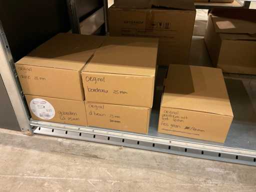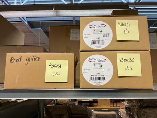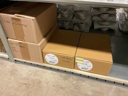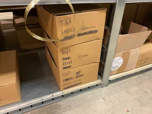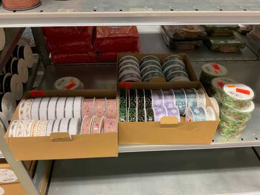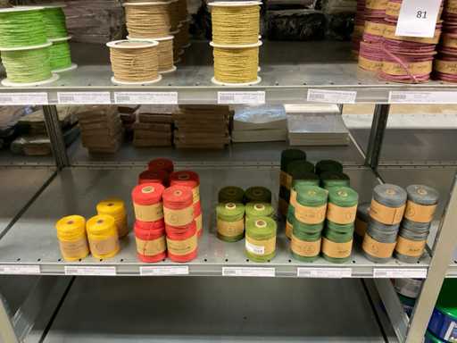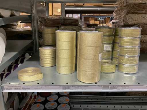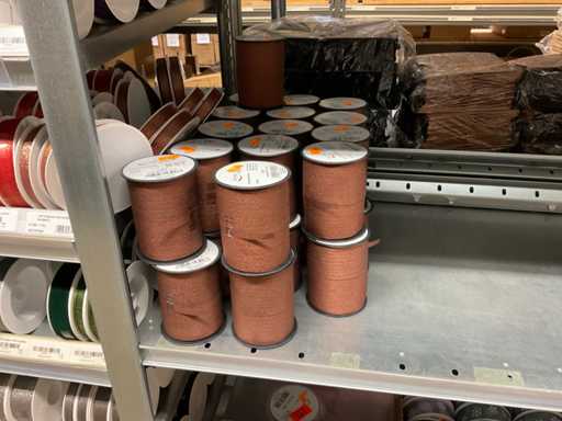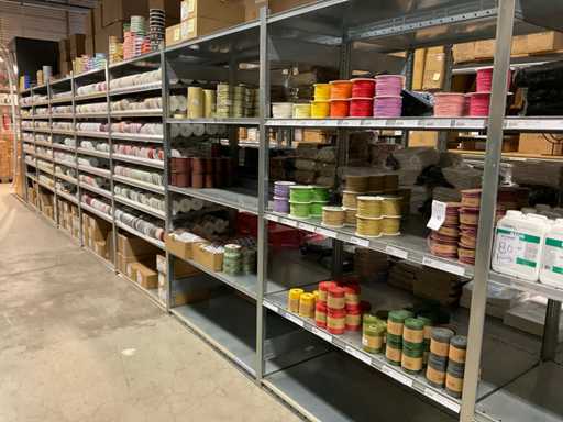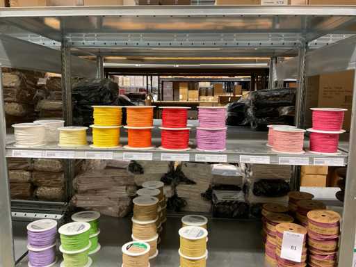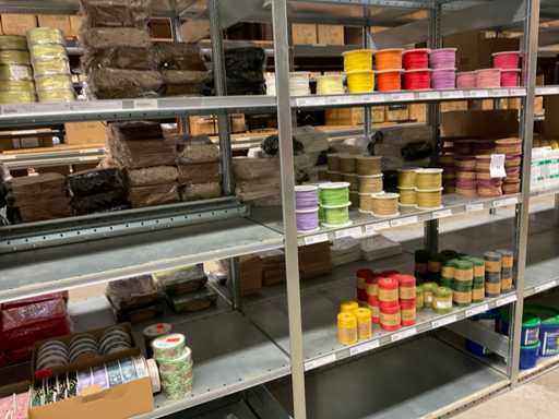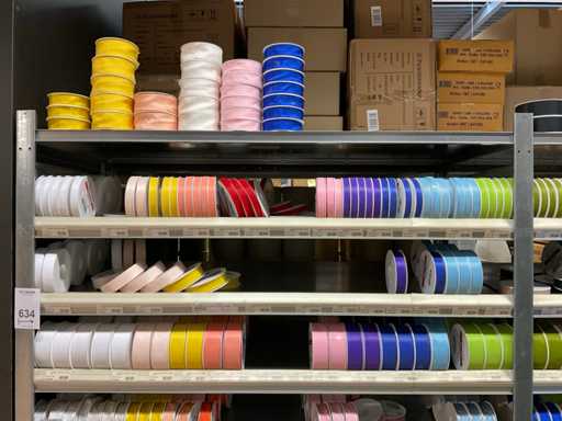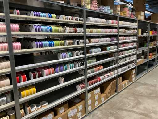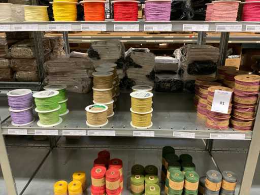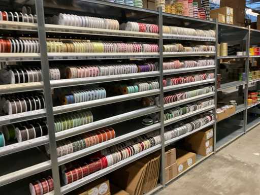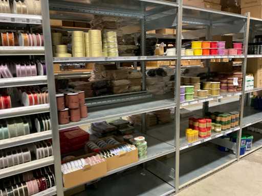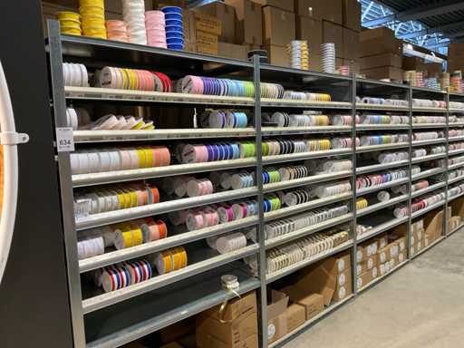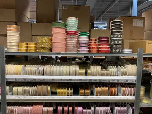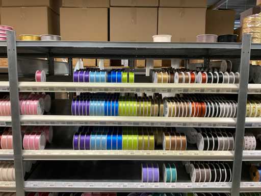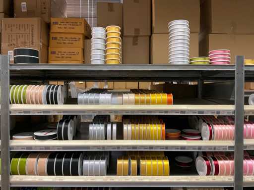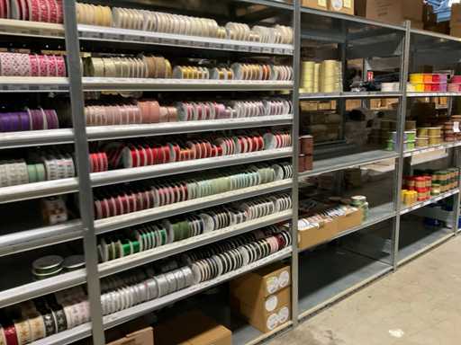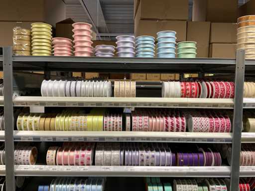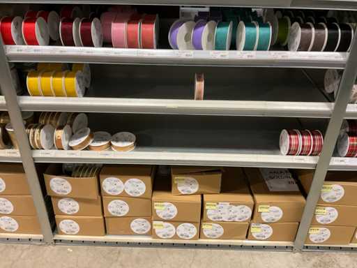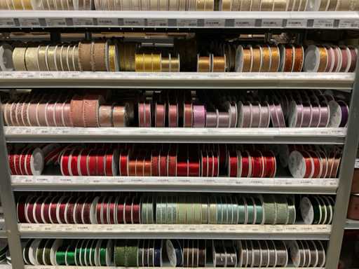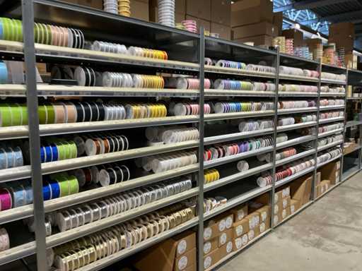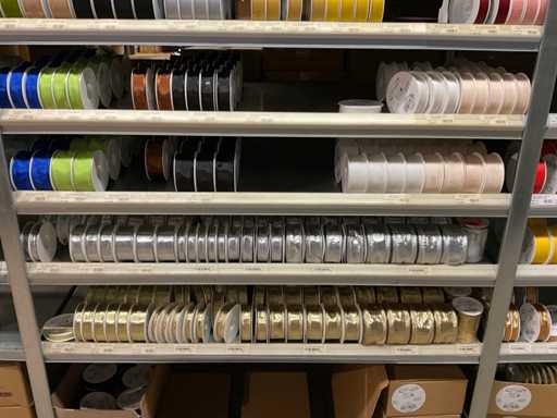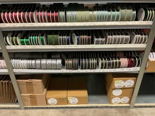 Bestaande uit diverse type, kleuren, breedtes en lengtes linten in 6 stellingsecties en diverse kleuren papierdraad en bollen jute touw in 2 stellingsecties