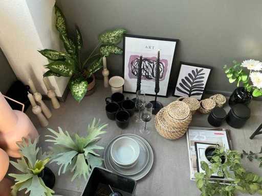 Verschillende soorten en maten waaronder kunstplanten, etagiere, vazen en kaarsen.