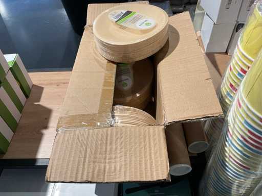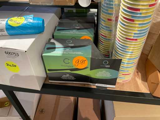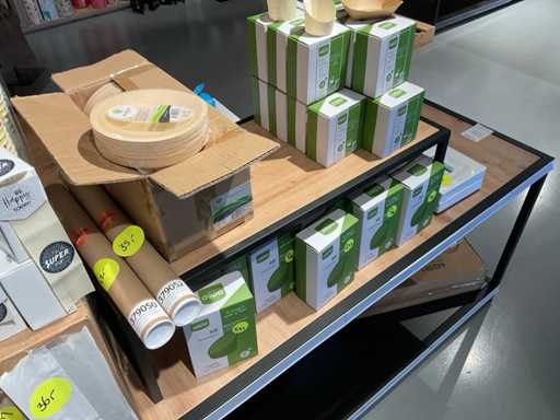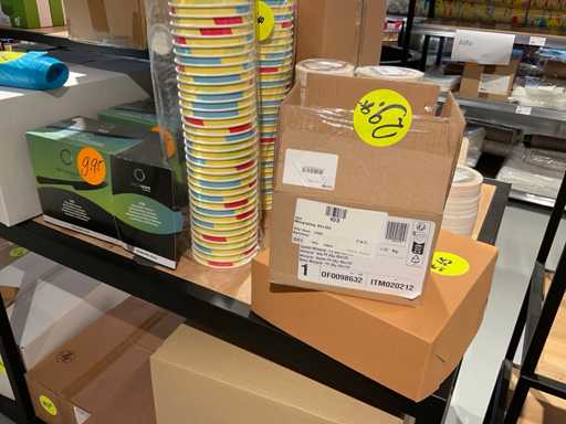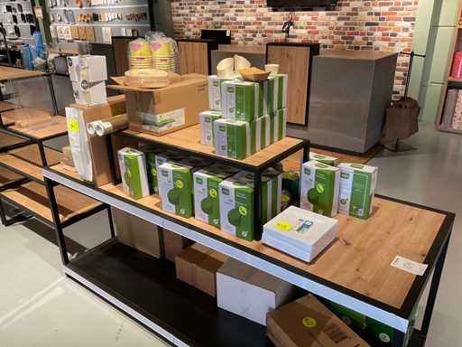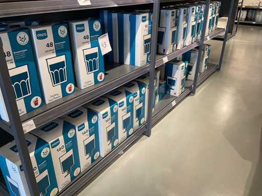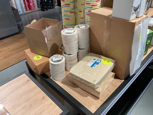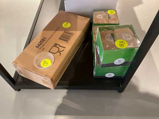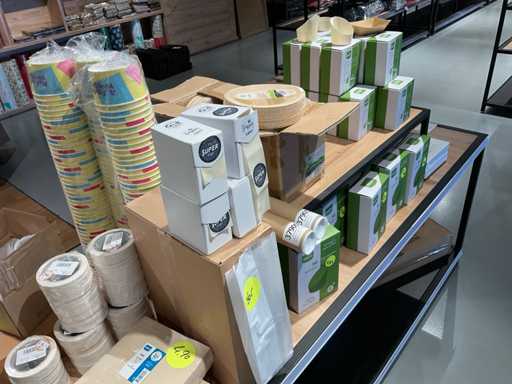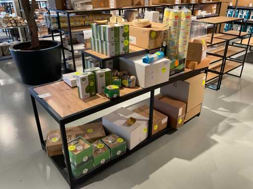 Inhoud van onderste 2 schappen van stelling, en presentatiemeubel, bestaande o.a. uit diverse soorten glazen, bestek, bekers en stickers. Exclusief stelling en presentatiemeubel.