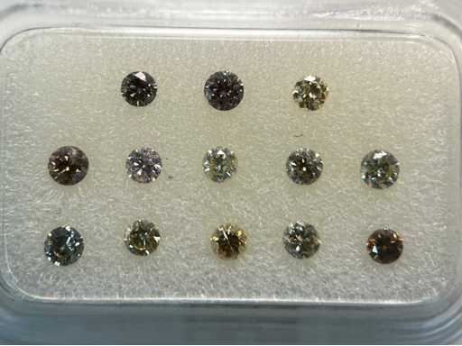 Diamant: Natuurlijk; Aantal: 13 stuks; Slijpvorm: Briljant geslepen; Gewicht (carat): 0.52 carat; Kleur: Natural fancy mix colours; Zuiverheid: VVS1-SI1; Certificaat: AIG; Certificaat nummer: D1930126325; Conditie: Nieuw; Verpakking: Edelsteendoos; Toelichting: De kwaliteit is overgenomen van het rapport behorend bij item. De waardebepaling is een beoordeling van een gecertificeerde diamantair, gebaseerd op consumentenprijzen.; Consumentenprijs: € 2.640,-