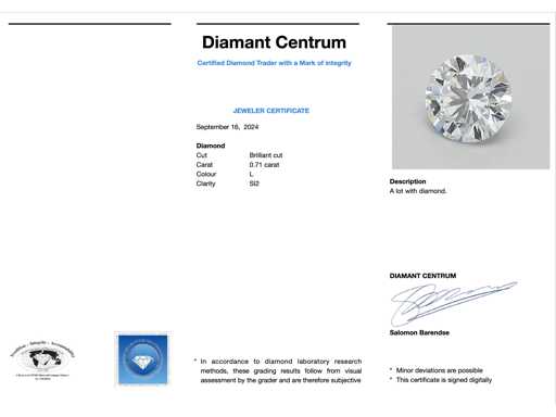 Diamant: Natuurlijk; Aantal: 1 stuk; Slijpvorm: Briljant geslepen; Gewicht (carat): 0.71 carat; Kleur: L; Zuiverheid: SI2; Slijpkwaliteit: Zeer mooi; Conditie: Nieuw; Verpakking: Edelsteendoos; Toelichting: De kwaliteit is overgenomen van het rapport behorend bij item. De waardebepaling is een beoordeling van een gecertificeerde diamantair, gebaseerd op consumentenprijzen.; Consumentenprijs: € 3.960,-
