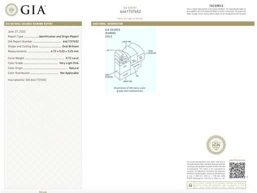 Diamant: Natuurlijk; Aantal: 1 stuk; Slijpvorm: Ovaal geslepen; Gewicht (carat): 0.72 carat; Kleur: Very light pink; Certificaat: GIA; Certificaat nummer: 6461737652; Conditie: Nieuw; Verpakking: Edelsteendoos; Toelichting: De kwaliteit is overgenomen van het rapport behorend bij item. De waardebepaling is een beoordeling van een gecertificeerde diamantair, gebaseerd op consumentenprijzen.; Consumentenprijs: € 70.000,-