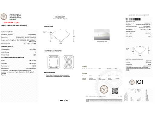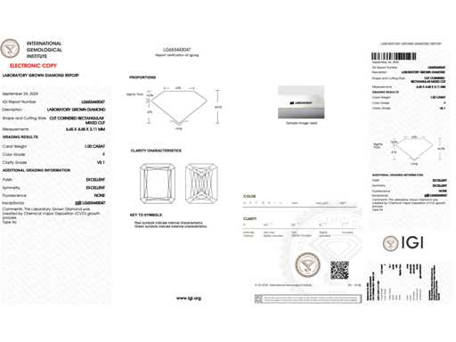 Diamant: ECO (lab-grown); Aantal: 1 stuk; Slijpvorm: Radiant geslepen; Gewicht (carat): 1.00 carat; Kleur: F; Zuiverheid: VS1; Slijpkwaliteit: Excellent; Certificaat: IGI; Certificaat nummer: LG653443047; Conditie: Nieuw; Verpakking: Luxe sieradendoos; Toelichting: De kwaliteit is overgenomen van het rapport behorend bij item. De waardebepaling is een beoordeling van een gecertificeerde diamantair, gebaseerd op consumentenprijzen.; Consumentenprijs: € 3.375,-