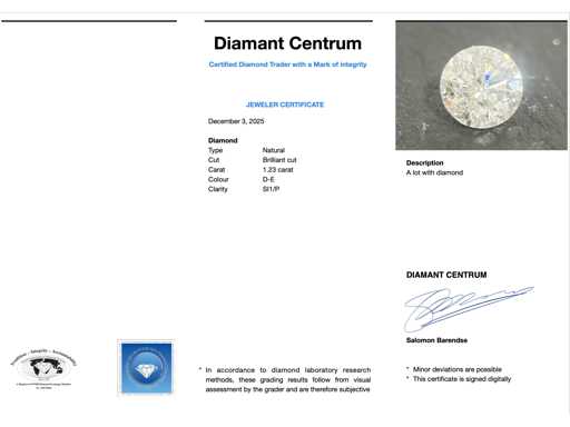Diamant: Natuurlijk; Aantal: 1 stuk; Slijpvorm: Briljant geslepen; Gewicht (carat): 1.23 carat; Kleur: D-E; Zuiverheid: SI1/P; Conditie: Nieuw; Verpakking: Edelsteendoos; Toelichting: De kwaliteit is overgenomen van het rapport behorend bij item.
