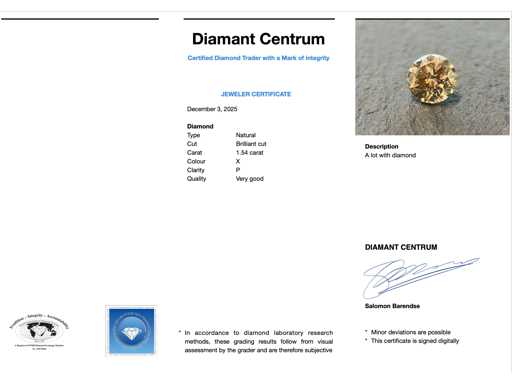 Diamant: Natuurlijk; Aantal: 1 stuks; Slijpvorm: Briljant geslepen; Gewicht (carat): 1.54 carat; Kleur: Commercial (X); Zuiverheid: P; Slijpkwaliteit: Zeer mooi; Conditie: Nieuw; Verpakking: Edelsteendoos; Toelichting: De kwaliteit is overgenomen van het rapport behorend bij item. De waardebepaling is een beoordeling van een gecertificeerde diamantair, gebaseerd op consumentenprijzen.; Consumentenprijs: € 6.000,-