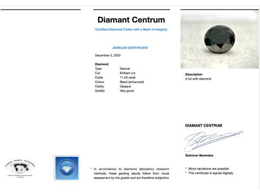 Diamant: Natuurlijk; Aantal: 1 stuk; Slijpvorm: Briljant geslepen; Gewicht (carat): 11.28 carat; Kleur: Zwart (enhanced); Zuiverheid: Opaak; Slijpkwaliteit: Heel mooi; Conditie: Nieuw; Verpakking: Edelsteendoos; Toelichting: De kwaliteit is overgenomen van het rapport behorend bij item. De waardebepaling is een beoordeling van een gecertificeerde diamantair, gebaseerd op consumentenprijzen.; Consumentenprijs: € 9.020,-