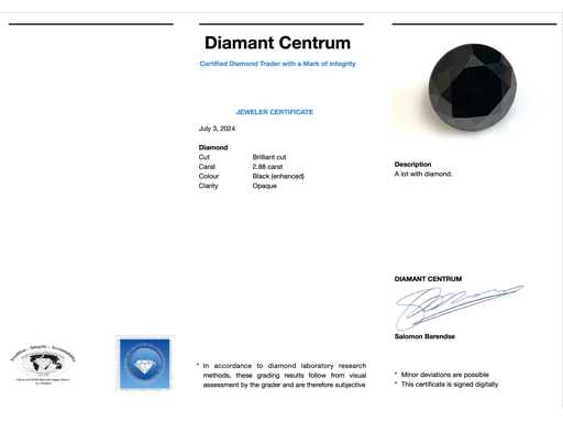 Diamant: Natuurlijk; Aantal: 1 stuk; Slijpvorm: Briljant geslepen; Gewicht (carat): 2.88 carat; Kleur: Zwart (enhanced); Zuiverheid: Opaak; Conditie: Nieuw; Verpakking: Edelsteendoos; Toelichting: De kwaliteit is overgenomen van het rapport behorend bij item. De waardebepaling is een beoordeling van een gecertificeerde diamantair, gebaseerd op consumentenprijzen.; Consumentenprijs: € 2.200,-