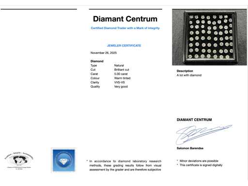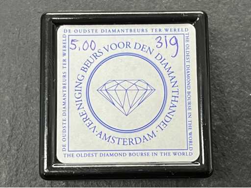Diamant: Natuurlijk; Slijpvorm: Briljant geslepen; Gewicht (carat): 5.00 carat; Kleur: Warm getint; Zuiverheid: VVS-VS; Slijpkwaliteit: Very good; Conditie: Nieuw; Verpakking: Edelsteendoos; Toelichting: De kwaliteit is overgenomen van het rapport behorend bij item. De waardebepaling is een beoordeling van een gecertificeerde diamantair, gebaseerd op consumentenprijzen.; Consumentenprijs: € 11.000,-