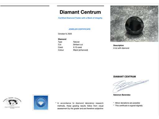 Diamant: Natuurlijk; Aantal: 1 stuk; Slijpvorm: Briljant geslepen; Gewicht (carat): 6.10 carat; Kleur: Zwart (enhanced); Conditie: Nieuw; Verpakking: Edelsteendoos; Toelichting: De kwaliteit is overgenomen van het rapport behorend bij item. De waardebepaling is een beoordeling van een gecertificeerde diamantair, gebaseerd op consumentenprijzen.; Consumentenprijs: € 5.000,-