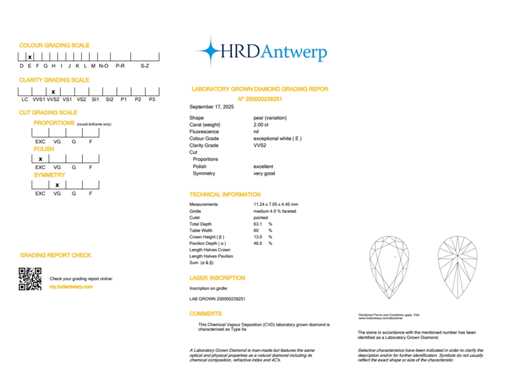 Diamant - pear 2.00 ct - E/VVS2 (HRD gecertificeerd)