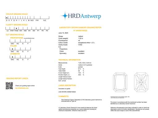 Diamant - radiant 1.02 ct - D/VVS2 (HRD gecertificeerd)