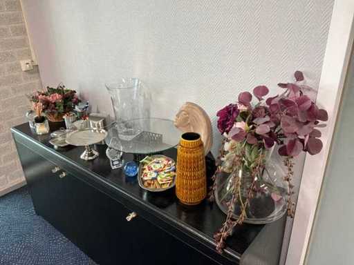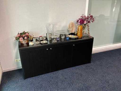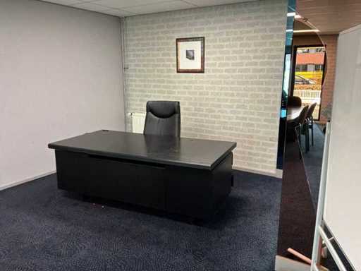 Bestaande uit: 1 6-ladig bureau, blad afmeting: L200 x B99 cm, 1 vergadertafel, blad afmeting: L270 x B120 cm, 1 dressoir, afmeting: B175 x D45 x H75 cm, 1 verrijdbare whiteboard en decoratie materiaal
