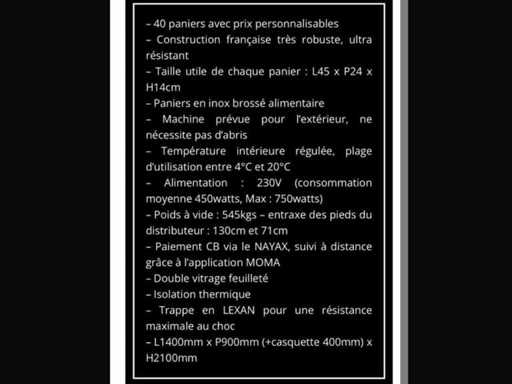 Afmetingen van elke kluis: 44cm/24cm/15cm, betaling via creditcard via NAYAX, afstandsmonitoring dankzij de MOMA-applicatie.