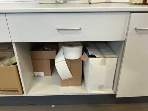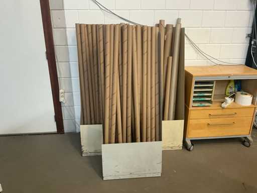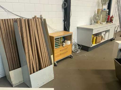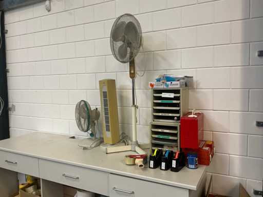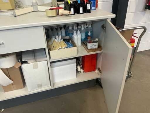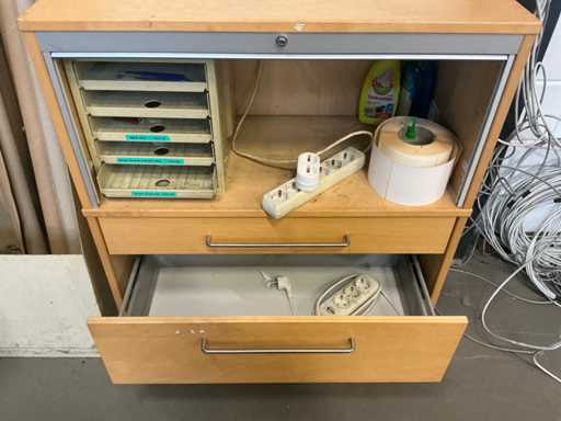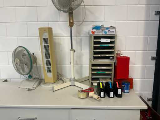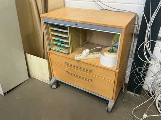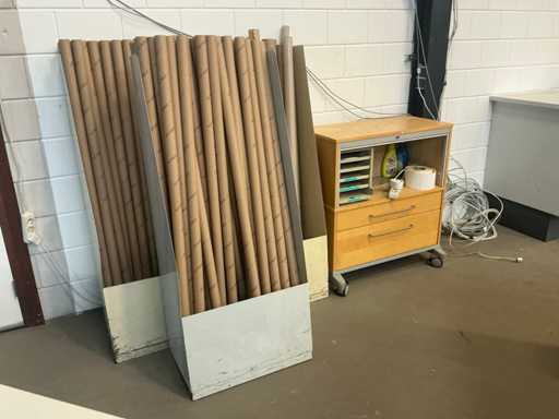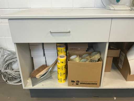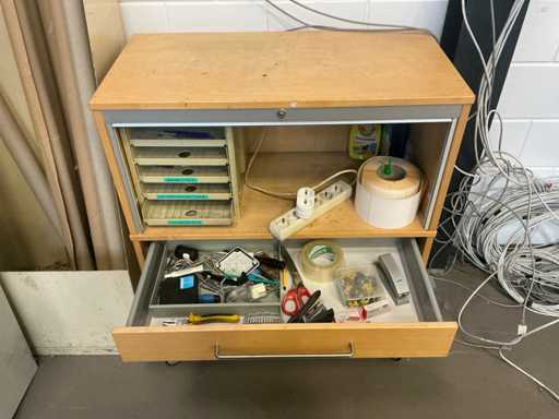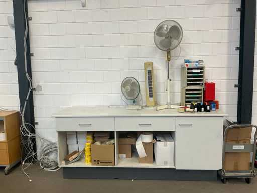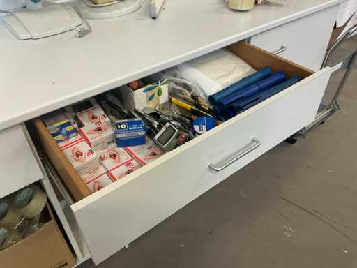 Bestaande uit kast (240cm) met inhoud, verrijdbaar meubel (85cm) met inhoud, 3x stale bak met kokers