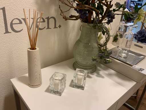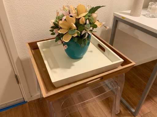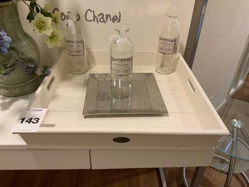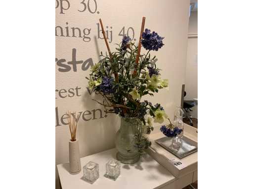 2 kunststof bijzettafels afm ca. 47x47x43 cm, vazen met kunstbloemen, houten dienblad, windlichten e.d.