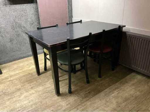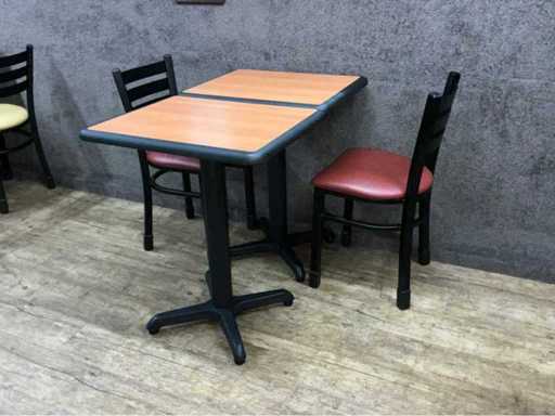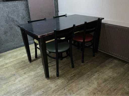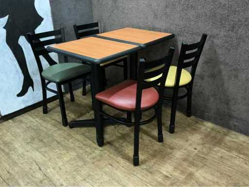 waaronder 1x houten tafel afmeting 1400x800 mm; 4x kleine tafel op centrale voet afmeting 610x510 mm; 10x houtennstoel; kunstleder zitting;
