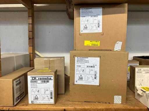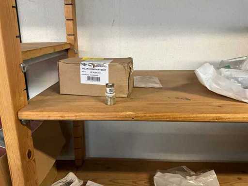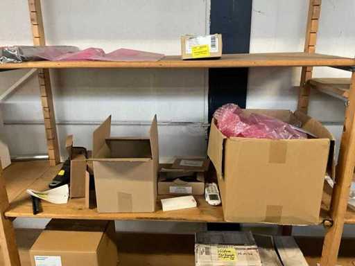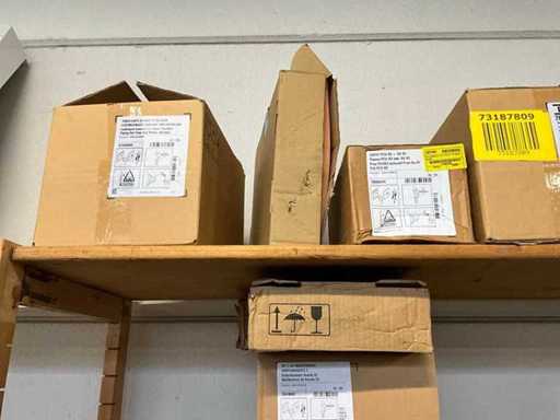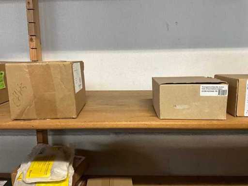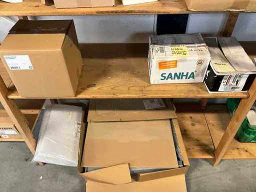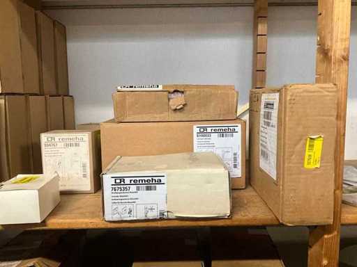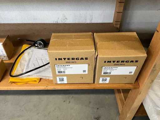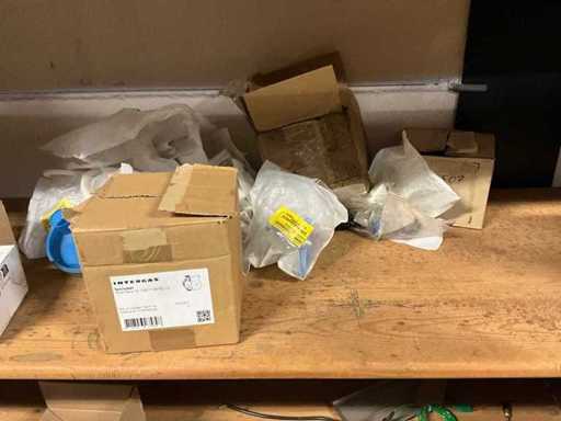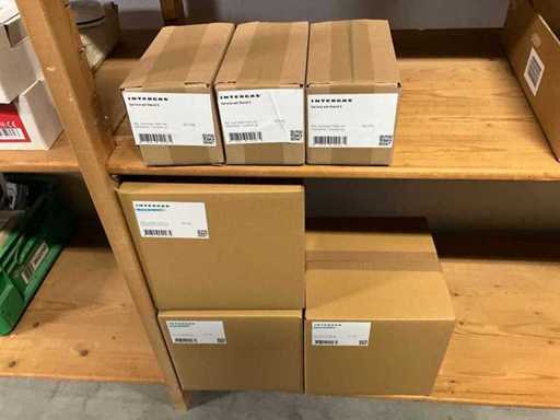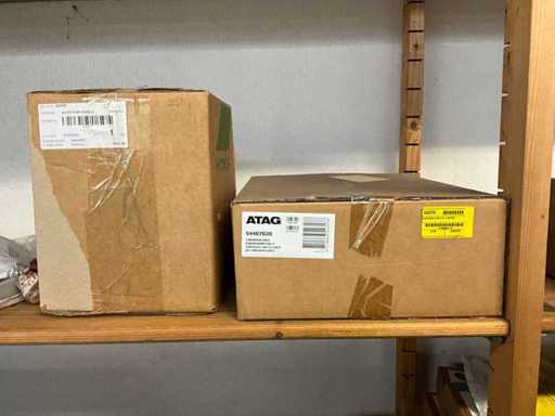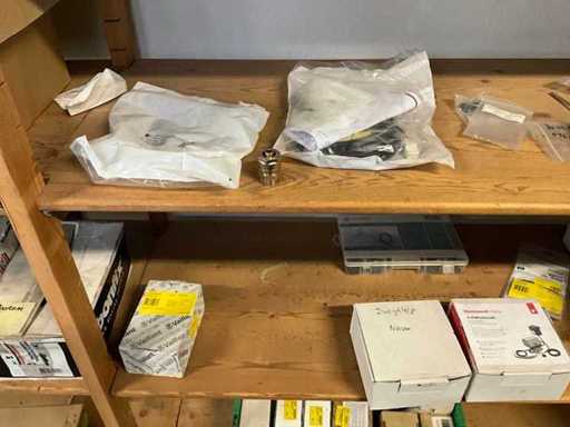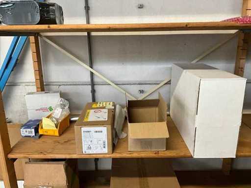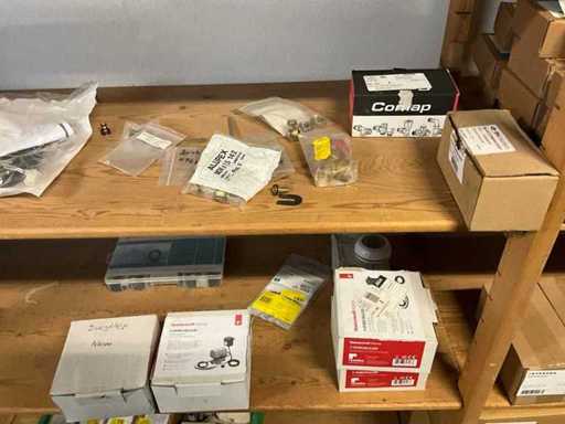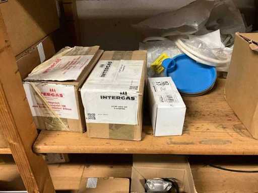 Inhoud van 6 secties legbordstelling; bestaande uit onder andere: Intergas Xtend service set, Enphase onderdelen, Atag S4407020 condensbak, Itho inlaatcombinatieset, Intergas onderhoudssets, Honeywell onderdelen, Remeha onderhoudssets en servicesets, etc