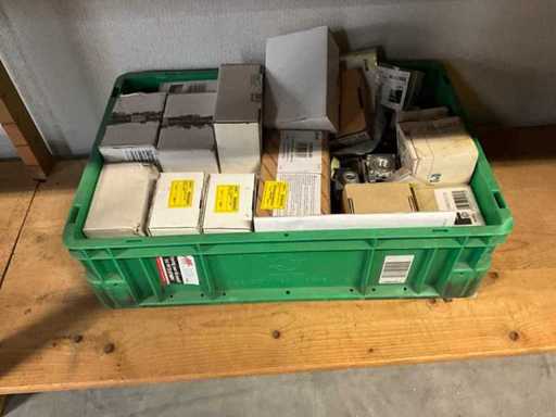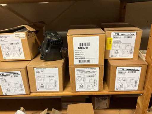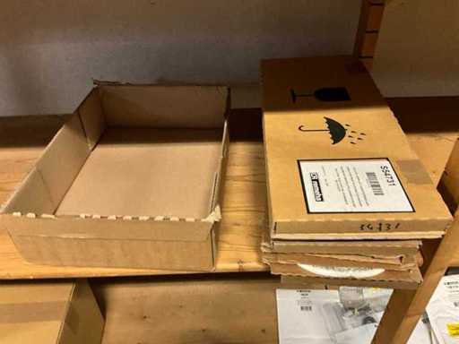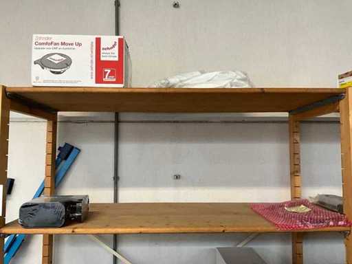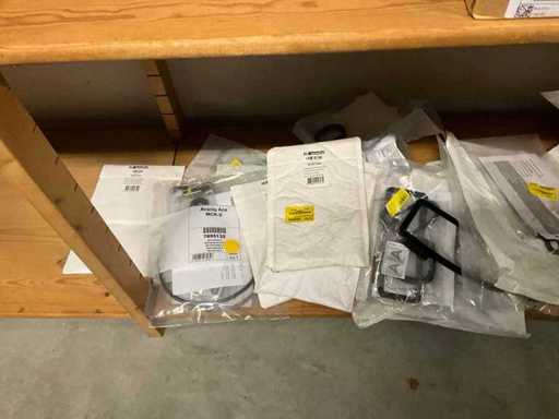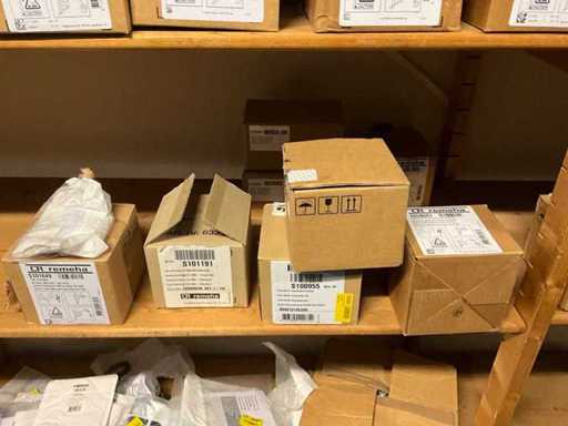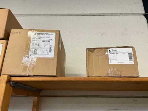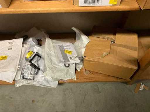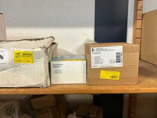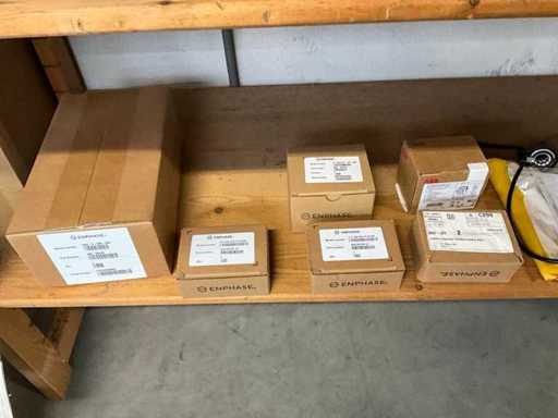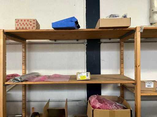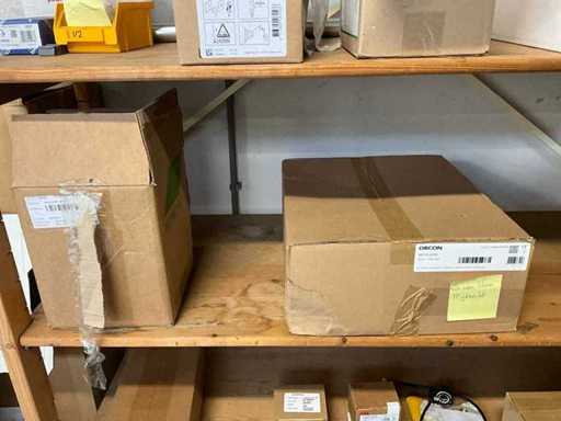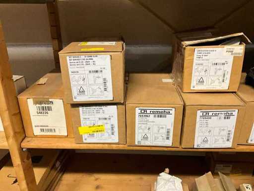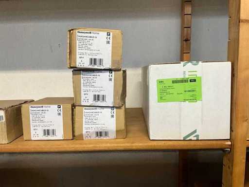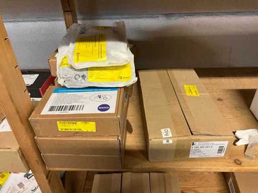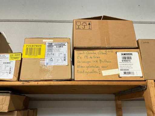 Inhoud van 6 secties legbordstelling; bestaande uit onder andere: Intergas Xtend service set, Enphase onderdelen, Atag S4407020 condensbak, Itho inlaatcombinatieset, Intergas onderhoudssets, Honeywell onderdelen, Remeha onderhoudssets en servicesets, etc