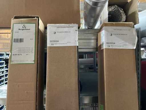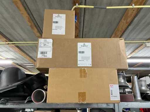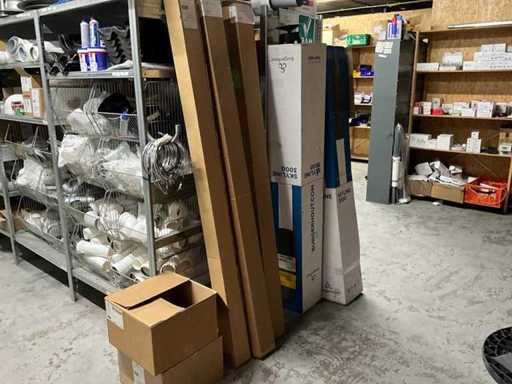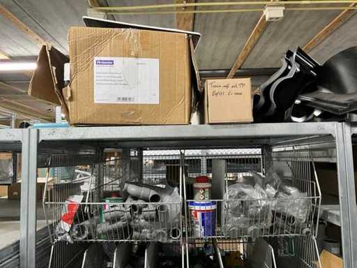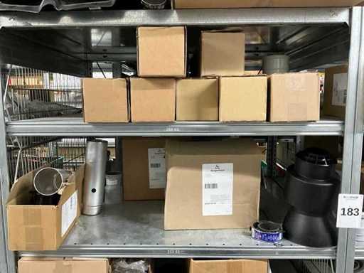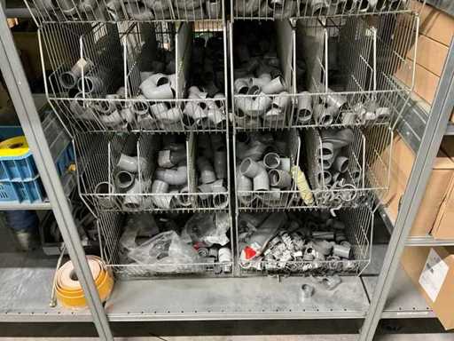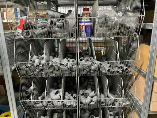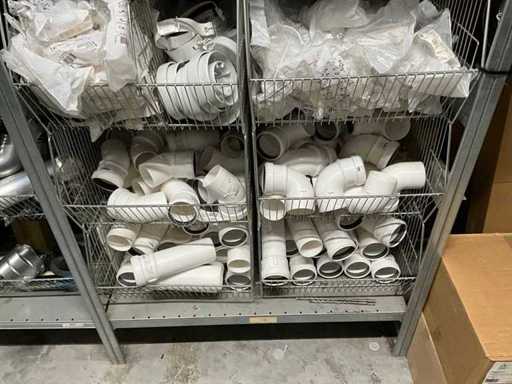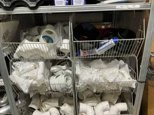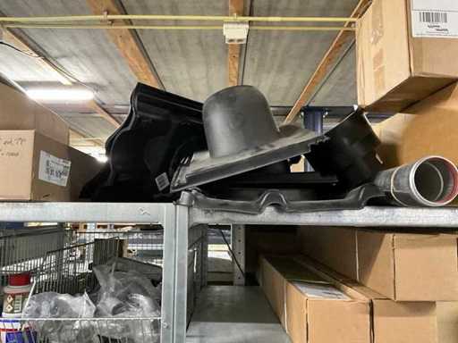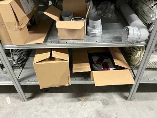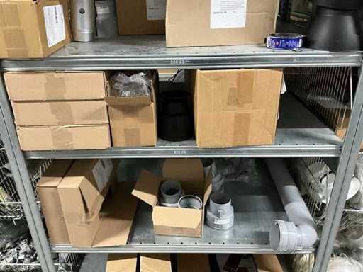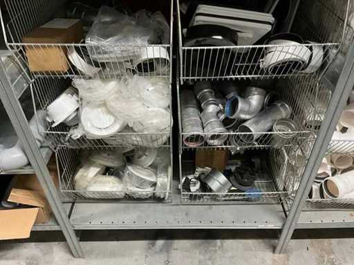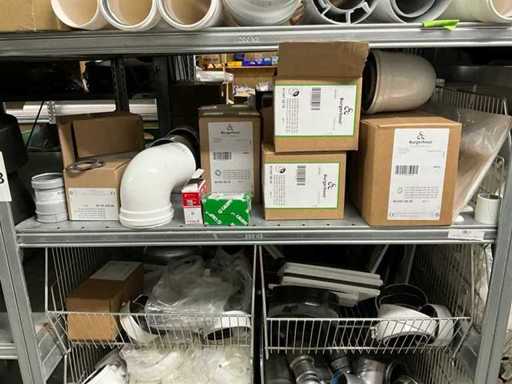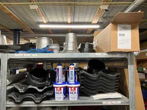 Inhoud van 4 secties legbordstelling; bestaande uit: diverse pvc bochten, Burgerhout dakmaterialen, Ubbink dakmaterialen, kunststof pannen, Burgerhout dakdoorvoeren, etc