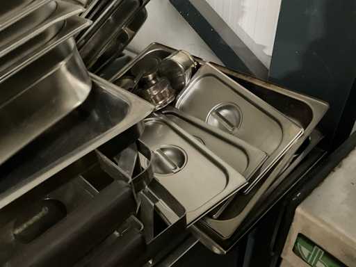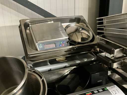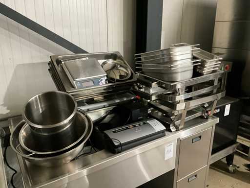 waaronder roestvast staal chafing onderstellen en GN bakken; GN deksels; vacumeermachine; digitale weegschaal; ijsemmer; verlek; bonnenprinter Epson;