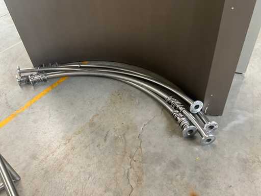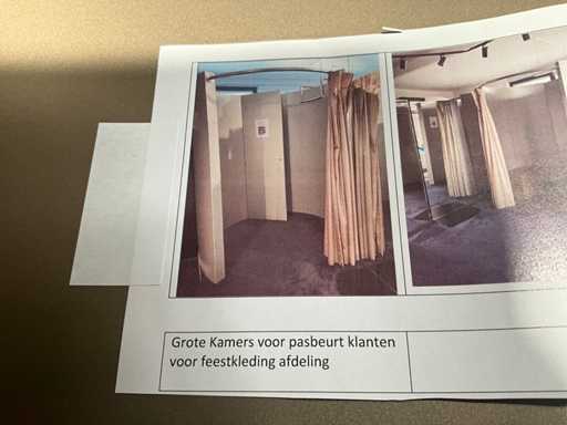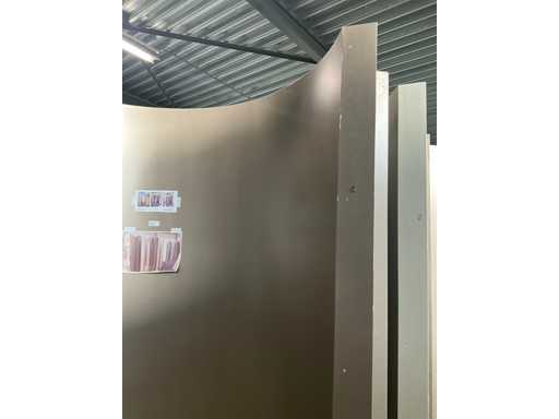 In halve cirkel uitvoering, elke paskamer voorzien van 2 gebogen wanden en 1 gebogen bar voor draperie vooraan. Niet voorzien van draperie en reeds gedemonteerd. Elk paneel is 150 cm breed en elke paskamer voorzien van rvs kledinghanger voor binnenin.