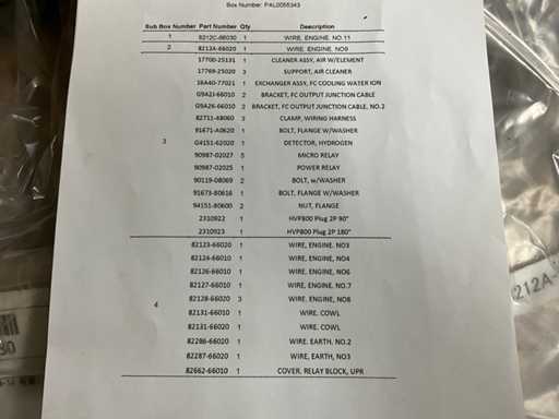 Bestaande uit onder andere: motor kabelboomsets, relays, hydrogen detectors, etc; betreft de inhoud van 4 dozen