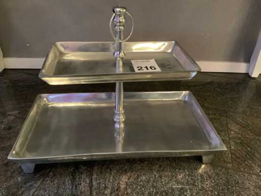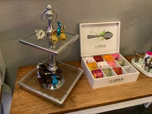 Bestaande uit 2 etagieres, vaas met kunstbloemen, fotolijst, theedoos